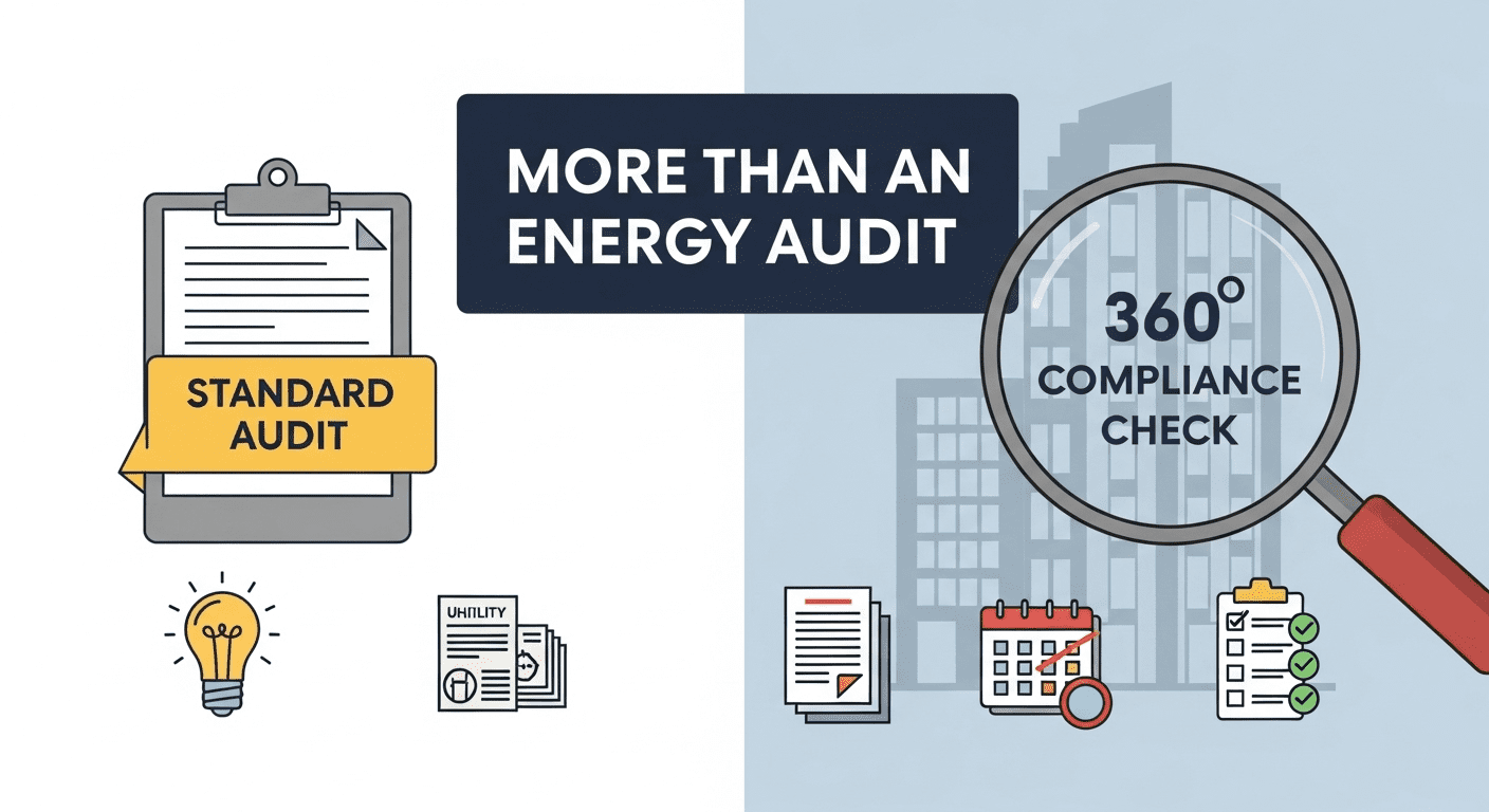 Think of the 360 Compliance Check as a deep dive into your building’s legal health. While a standard energy audit might help you find ways to save energy, it often overlooks the laws and regulations that determine whether your building is actually in compliance.