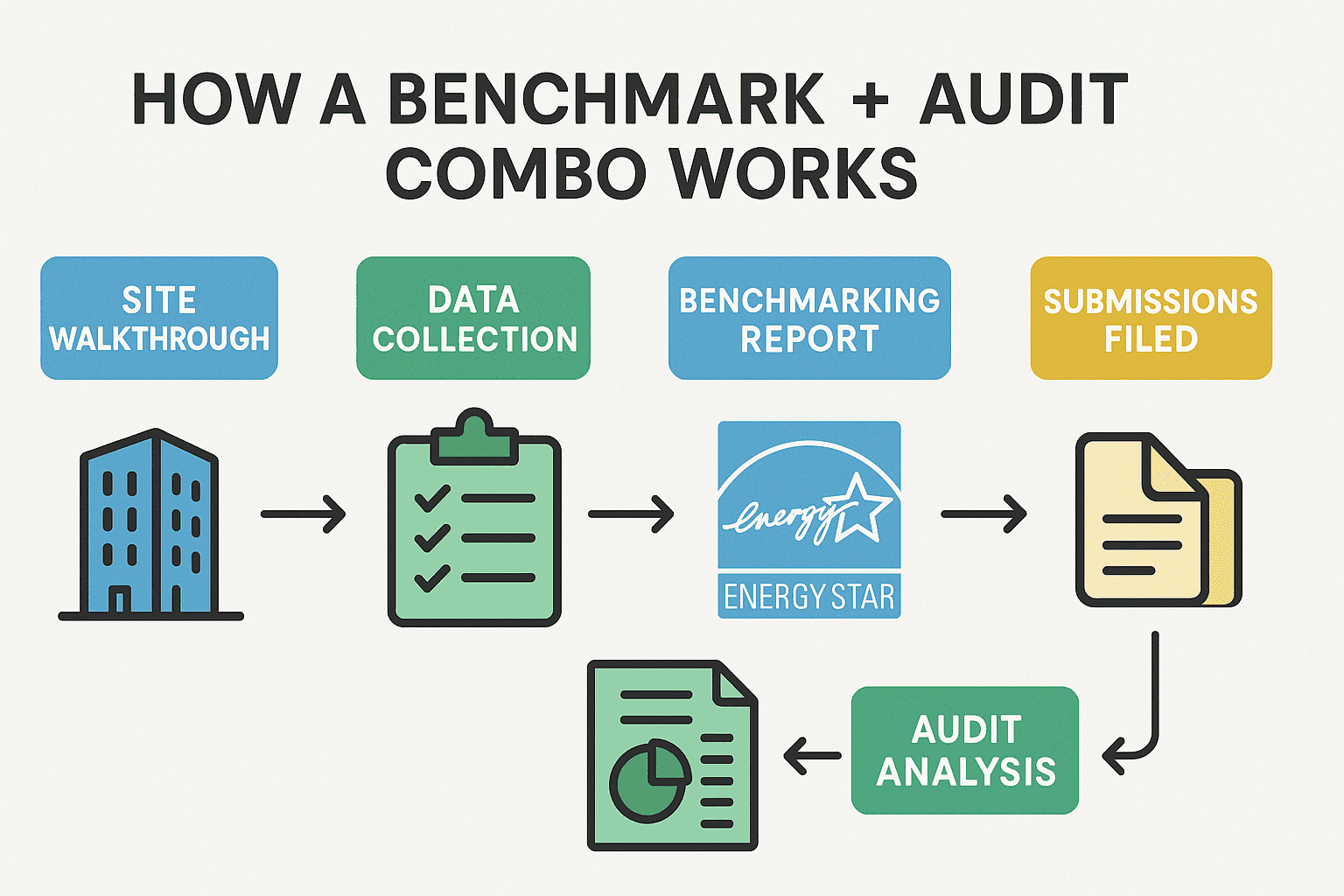 A combined energy audit and benchmark service checks off two key requirements with one appointment, and helps avoid missed deadlines, double fees, and compliance headaches.