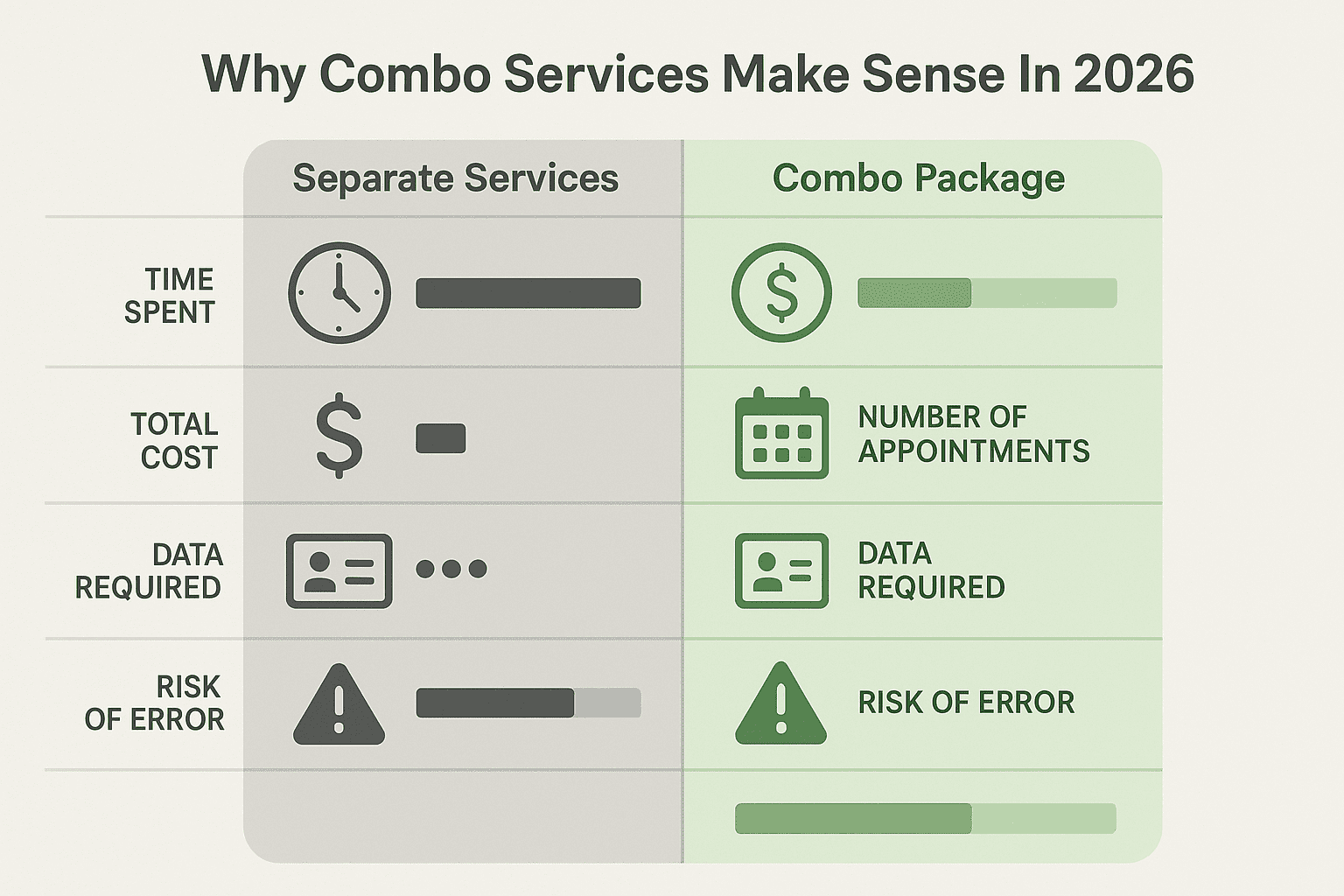 Now imagine doing both in one visit, with a bundled rate and unified timeline. You save hours of coordination and hundreds, sometimes thousands, of dollars in fees and overhead.