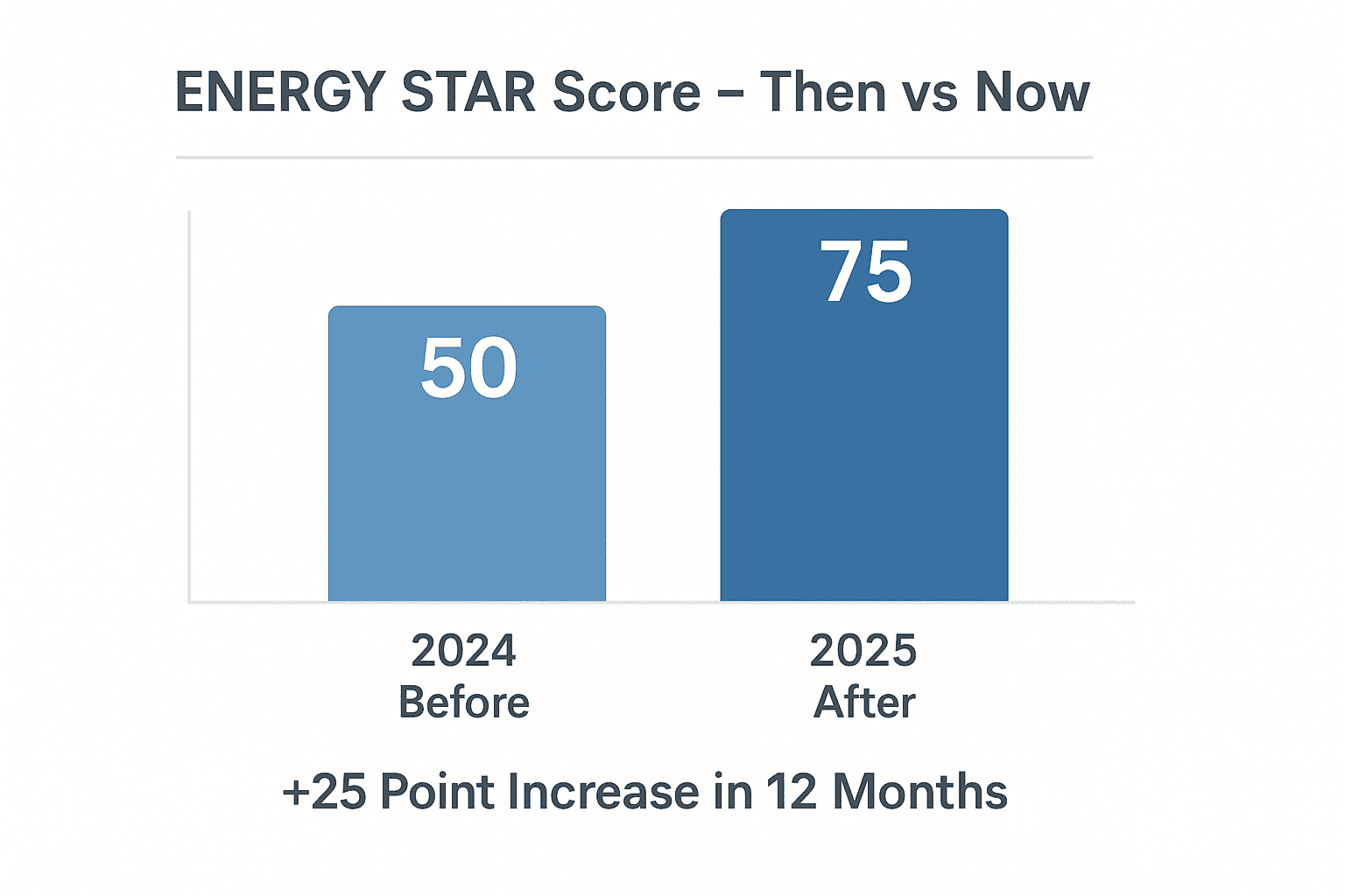 Improving the building’s ENERGY STAR score by 25 points elevated its competitive standing, attracted new interest from sustainability-conscious tenants, and gave the owner a new tool to leverage for financing and incentive programs.