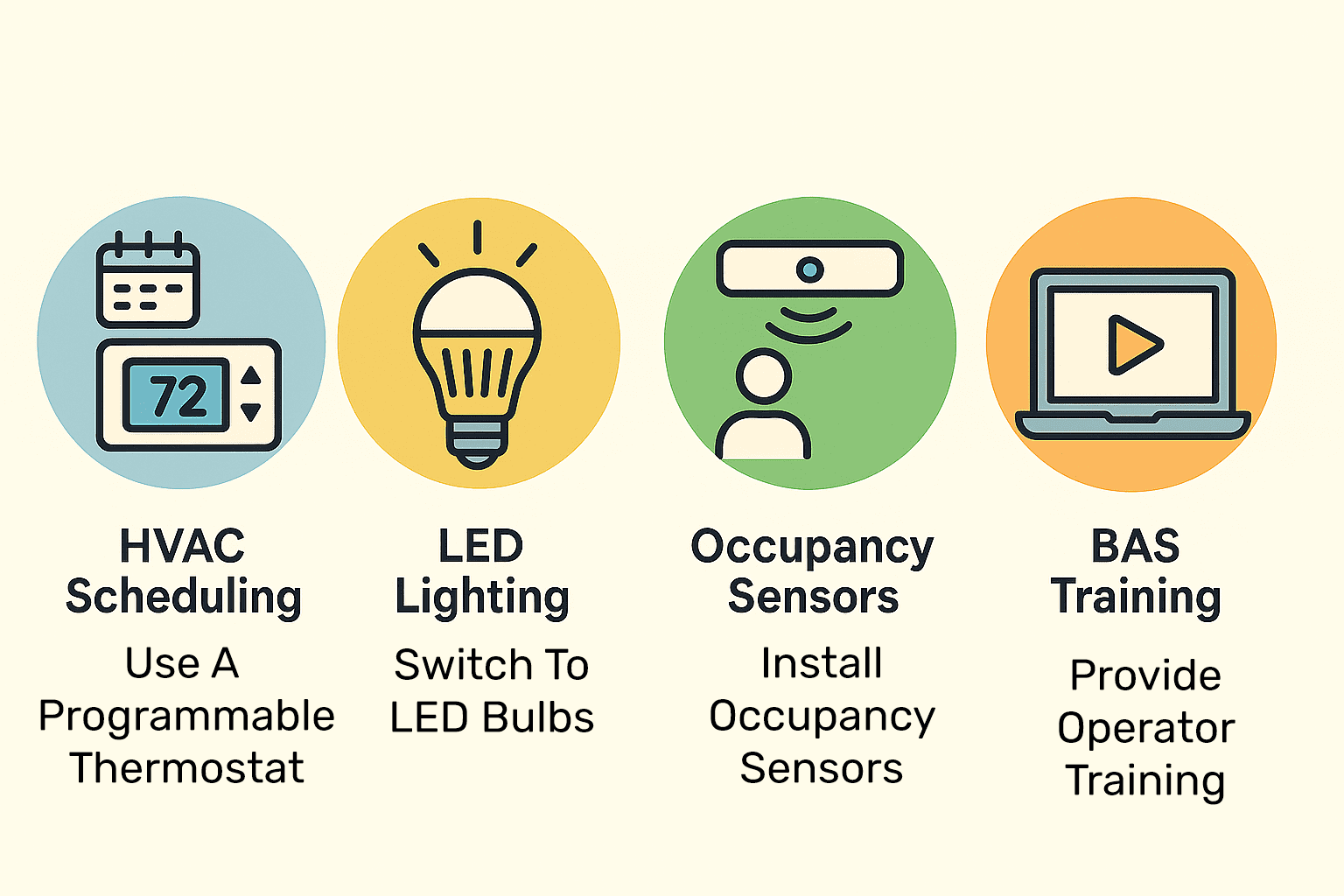 Start with low-cost, high-impact changes. Lighting and HVAC schedules are often the biggest wins.