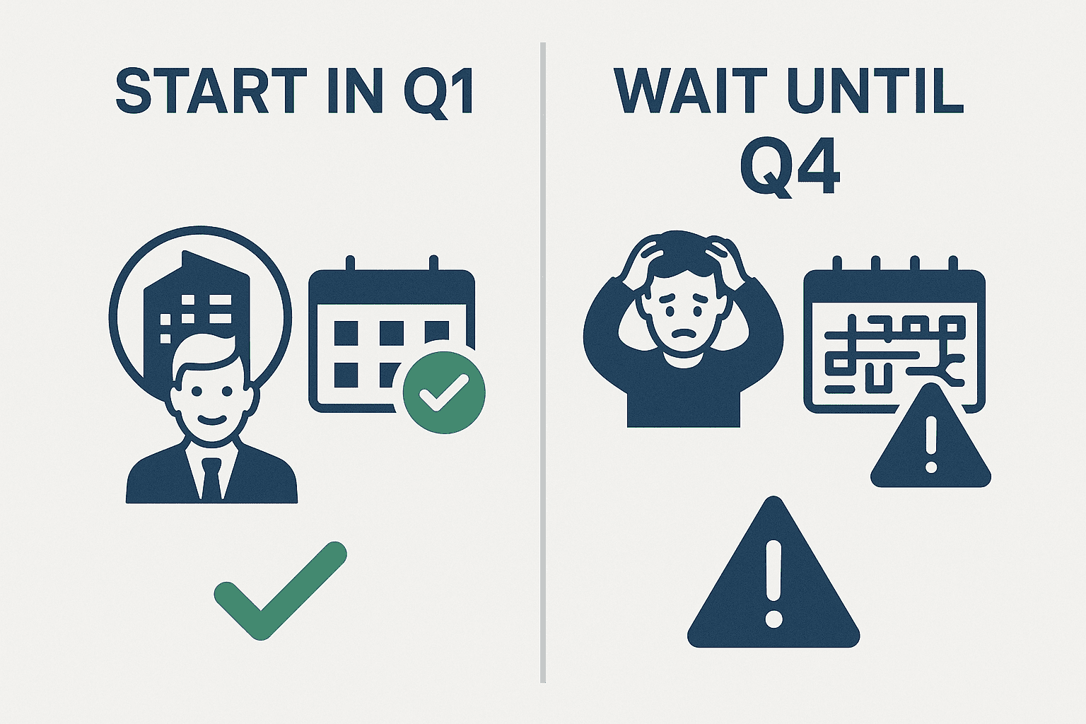 - Q1 pricing is often more flexible. Many audit firms offer better pricing or easier scheduling earlier in the year.