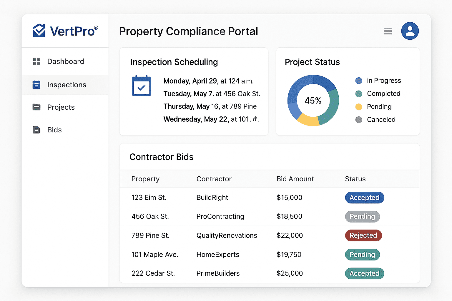VertPro® is more than a platform for sourcing bids. It’s a complete compliance management tool built for property owners, managers, and HOAs who want to minimize risk, stay informed, and maintain safe, law-abiding properties.