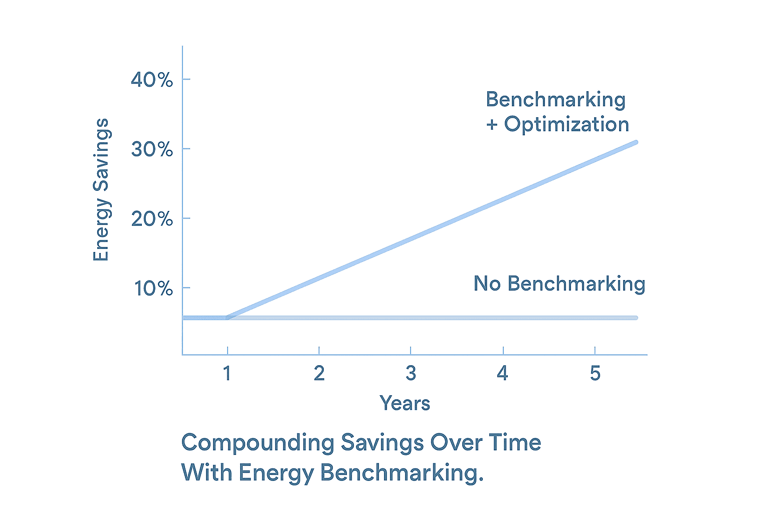 Benchmarking’s ROI is realized when insights lead to cost-saving action. This can eliminate energy waste, implementing low-cost retro-fits, and accessing rebates. According to ENERGY STAR data, buildings that benchmark consistently can reduce energy use by an average of 2.4% per year, with savings compounding over time. Over three years, that can result in a 10–30% reduction in energy costs with proper execution.