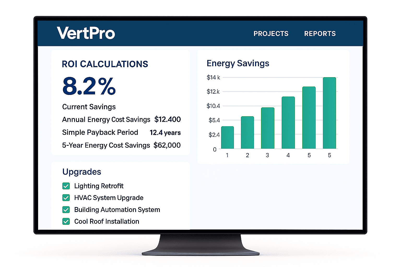 VertPro® helps commercial property owners and managers optimize building performance with technology-driven benchmarking and energy audit solutions. Whether you oversee one property or a nationwide portfolio, VertPro® gives you the tools to:
