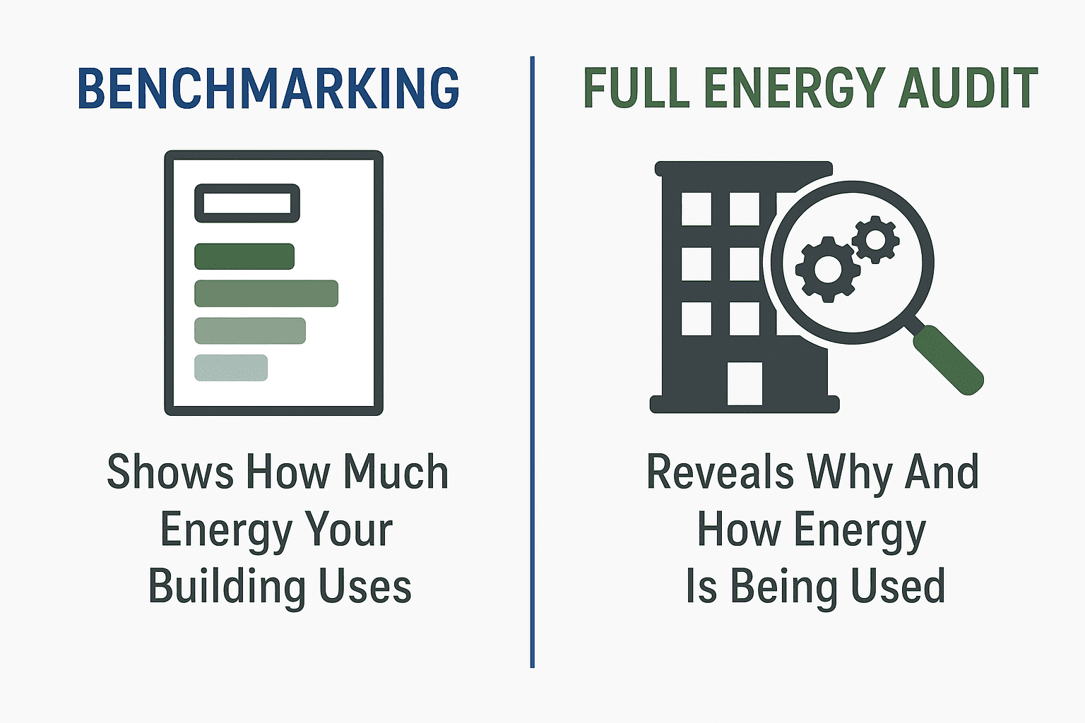 Benchmarking shows how much energy your building uses compared to similar buildings. It’s like getting your overall energy score. But it doesn’t explain why your building is using that much, or how to fix it.